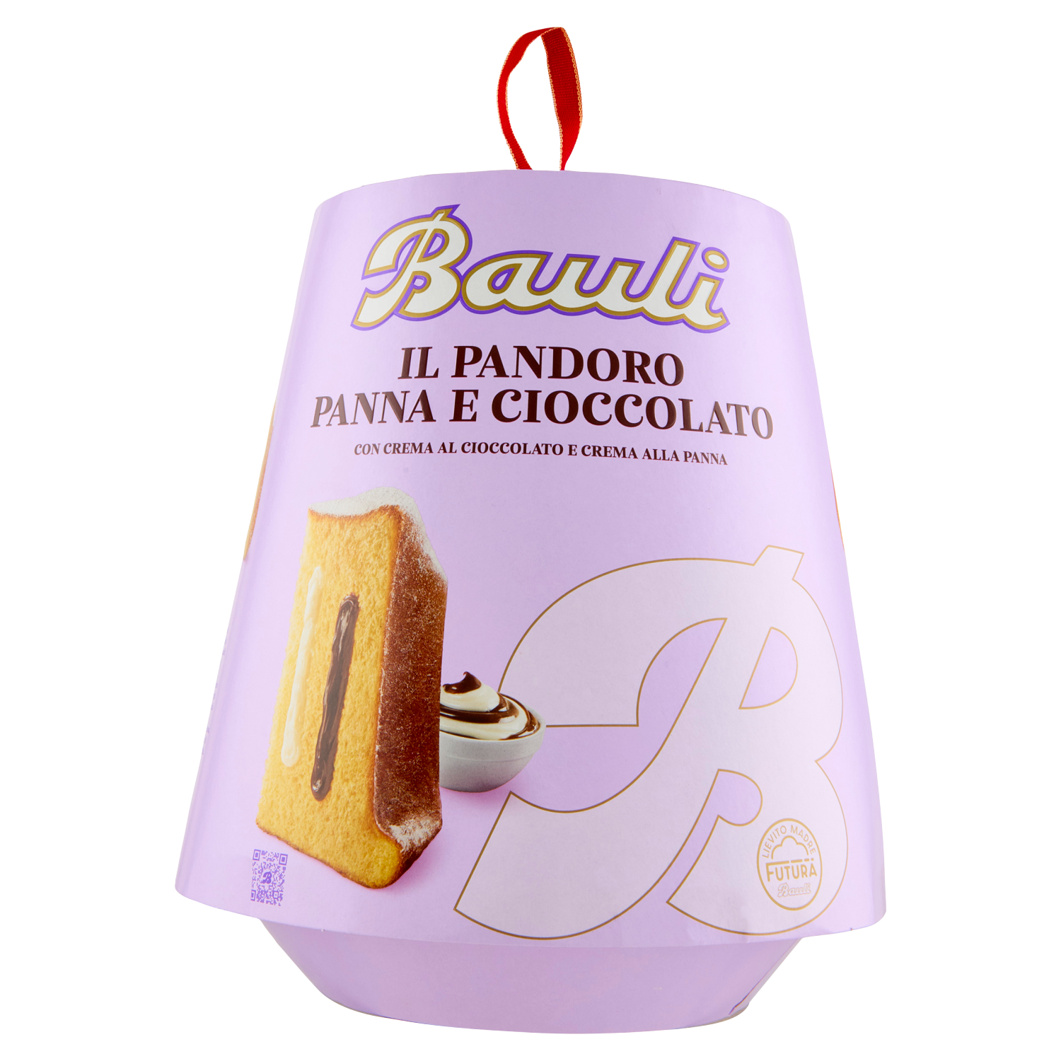 Bauli Pandoro Panna e Cioccolato is a soft and delicious Christmas cake, made with natural leavening and high-quality ingredients. The soft and fragrant dough encloses a delicious cream and chocolate filling, for an irresistible flavor that will delight both adults and children. Perfect for serving during the holidays or as a refined dessert for any special occasion.