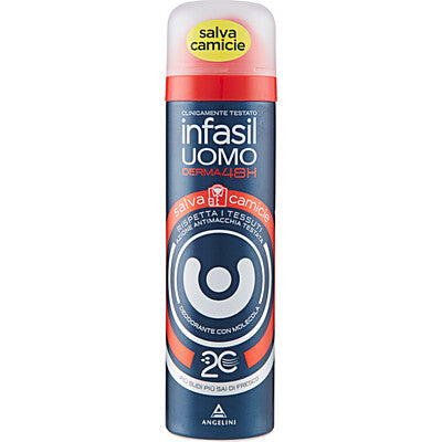 Discover Infasil Deodorant Spray for Men, 150 ml: a spray deodorant designed for men, with a dermatologically tested formula that protects against unpleasant odors and prevents stains or marks on clothing. It keeps you feeling fresh and comfortable all day long.