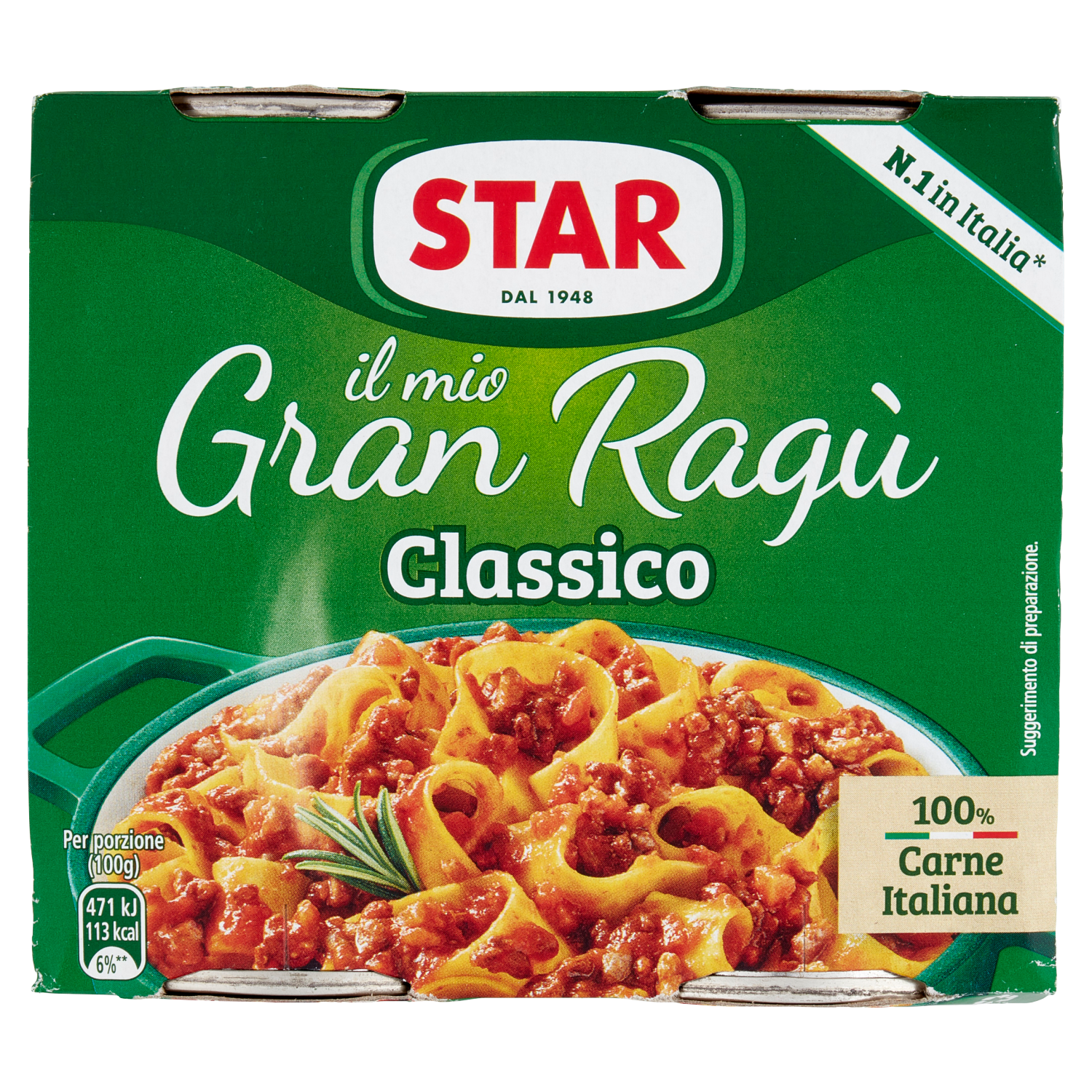 Star Gran Ragù is a ready-made meat sauce, prepared according to a traditional Italian recipe. With 100% Italian meat and quality tomatoes, it offers an authentic and rich flavor. Perfect for pasta, lasagna, and other first courses, it's the ideal solution for those seeking flavor and convenience in the kitchen.
